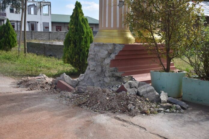 On November 12, artillery shells fired by junta forces exploded in farmlands belonging to local residents in Nam San Khan village, Nanmekhon Township, causing damage to residential houses and the monastery entrance.
